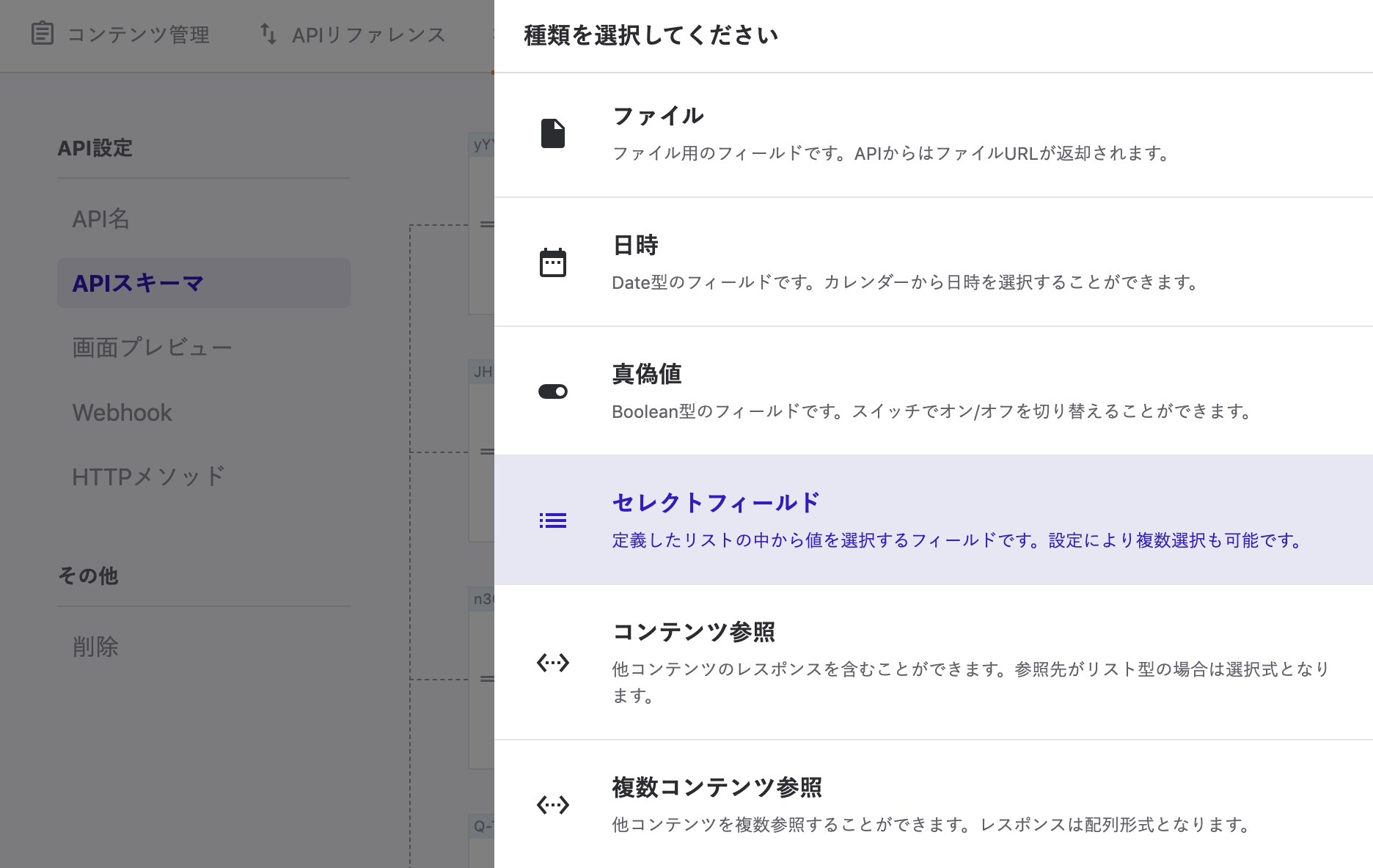 APIスキーマ設定にて、新しくセレクトフィールドが追加されていますので、そちらを選択してください。