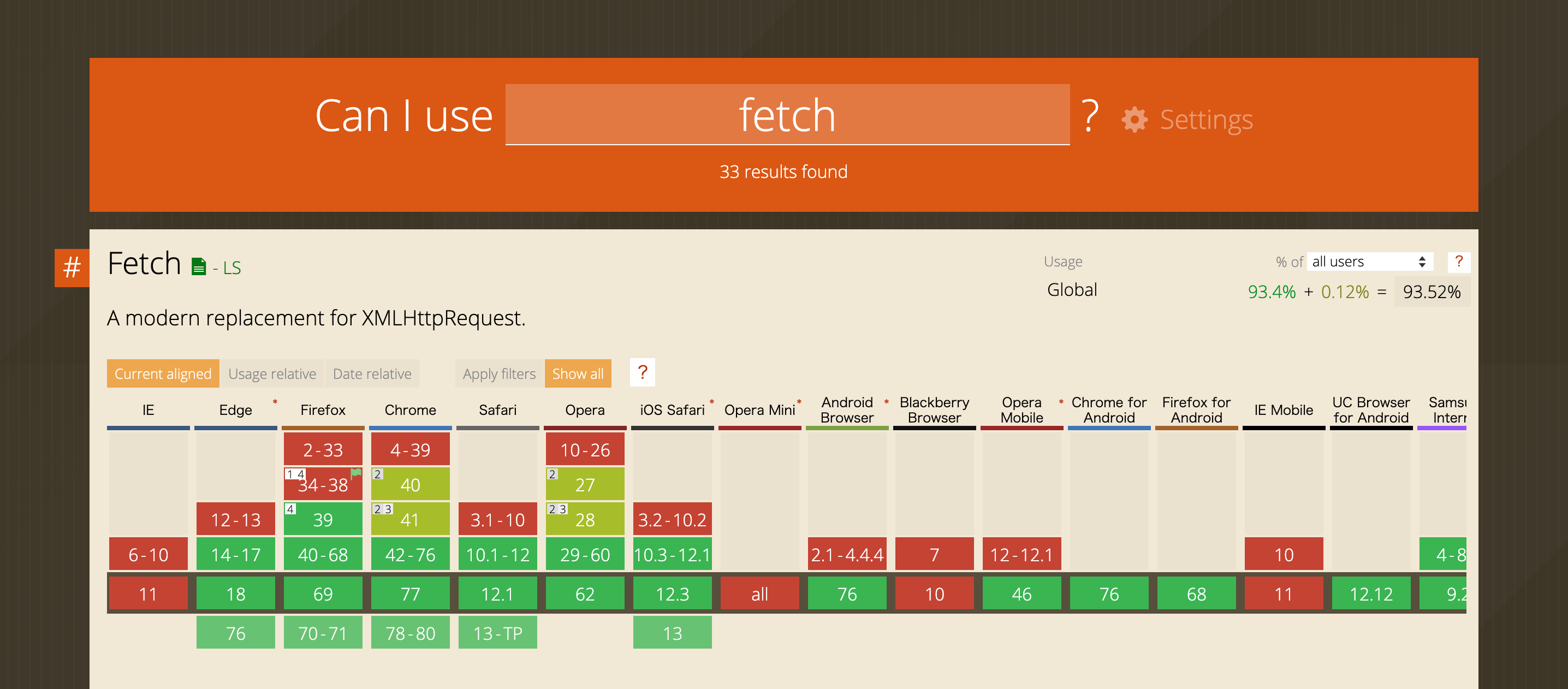 Fetch APIは非同期通信のための新たに策定されたAPIです。IE以外の主要ブラウザでは動作します。