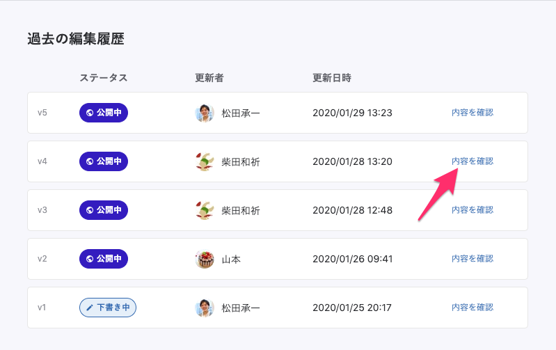 コンテンツの履歴は一覧で確認できるだけでなく、その内容を確認することもできます。