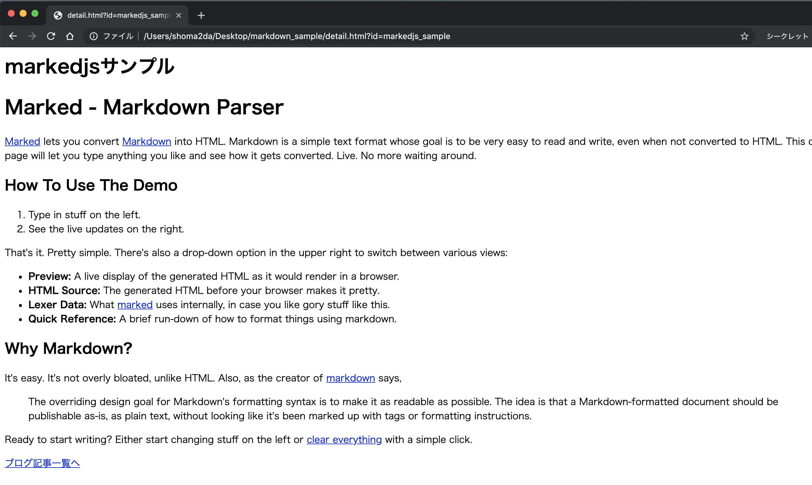 今回はMarkdown サンプルmarked demo pageに記載されたマークダウンテキストをコピーして作成しました。