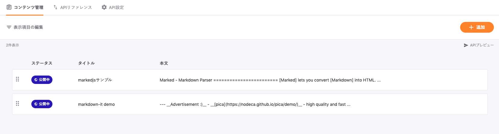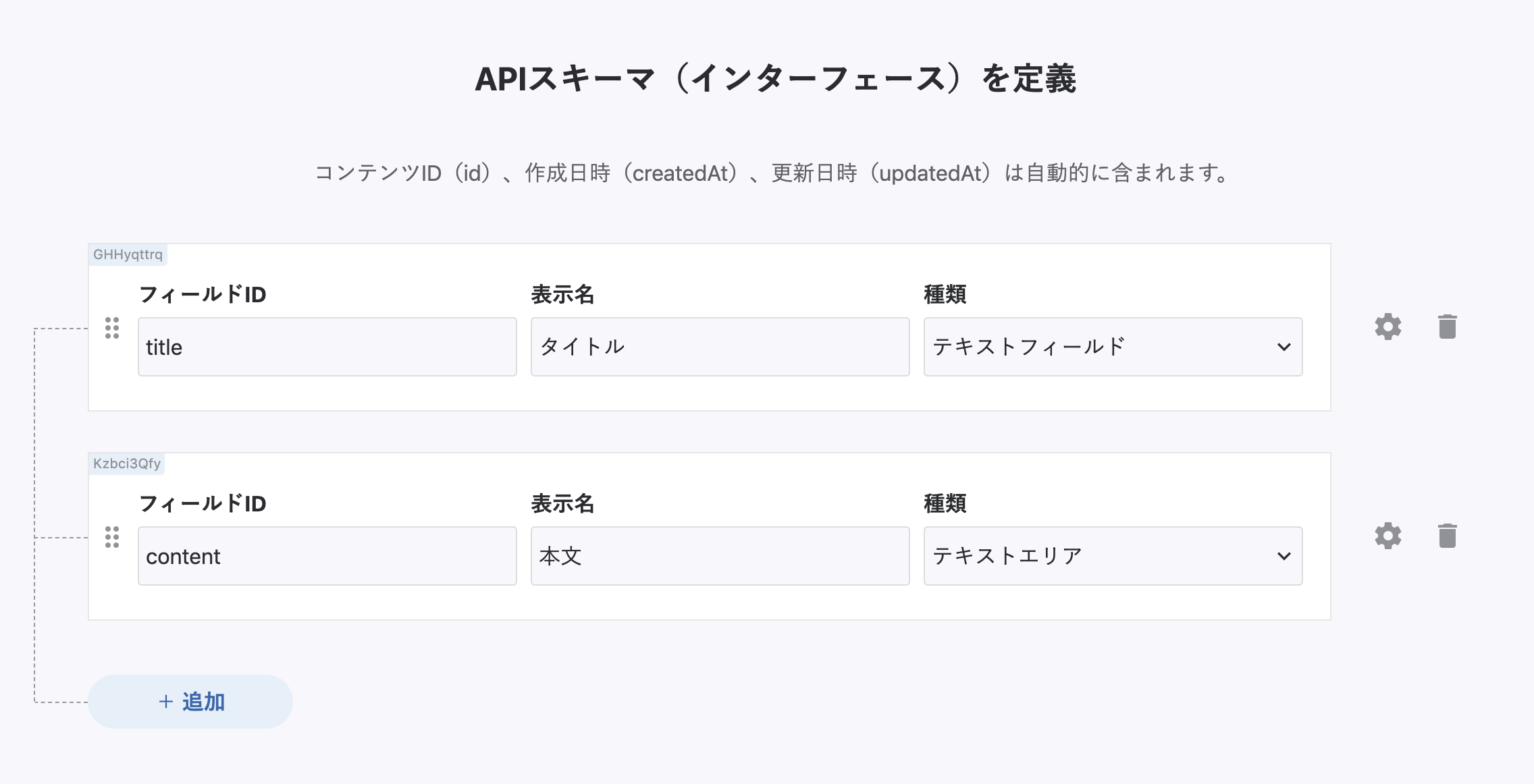• APIスキーマ:テキストフィールド形式のタイトル(title)、テキストエリア形式の本文(content)