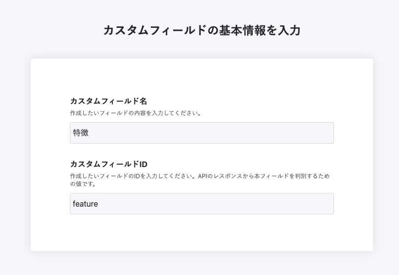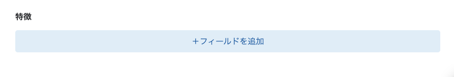先ほどと同じでカスタムフィールドを作成していきます。ここでは、カスタムフィールド名を特徴、カスタムフィールドIDをfeatureにしました。