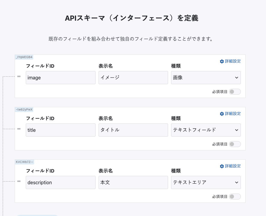 作成が完了したら、API設定 > APIスキーマから繰り返しフィールドを設定してみましょう。