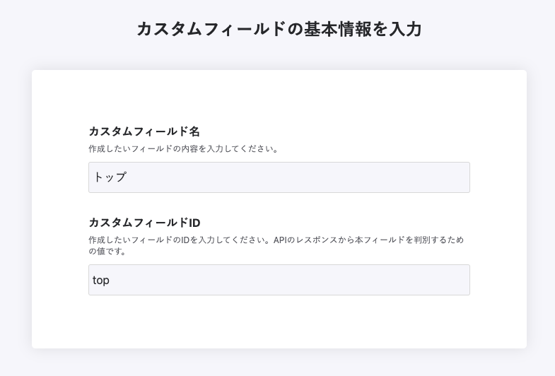 そして、カスタムフィールド名カスタムフィールドIDを入力します。ここでは、トップtopにしました。次へをクリックします。