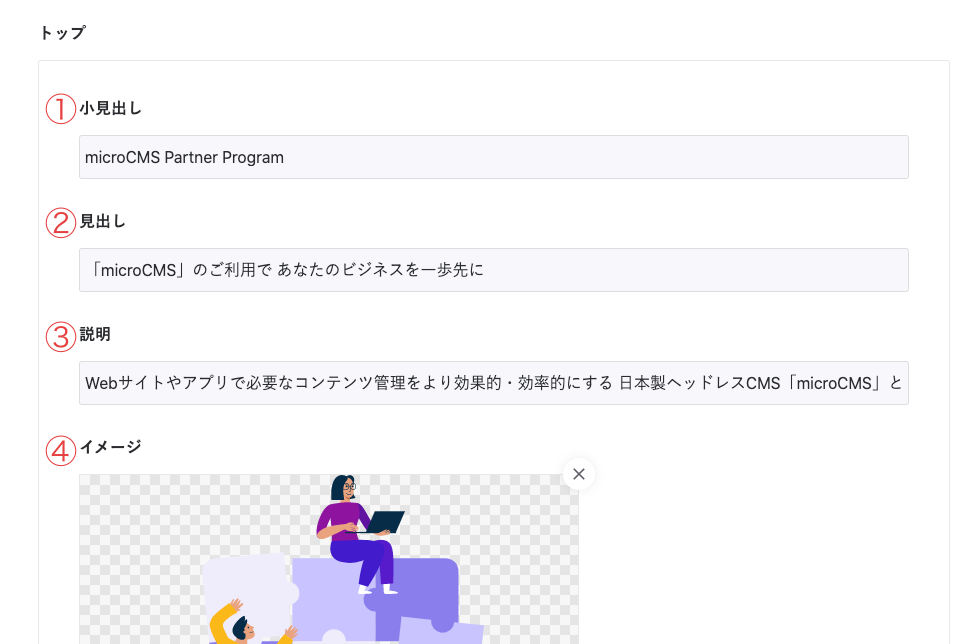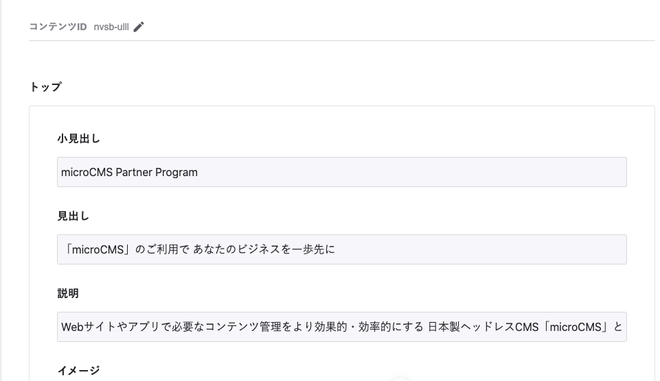 実際にコンテンツデータを入稿してみてください。、microCMSのパートナープログラムのランディングページのコンテンツを参考にしてもいいですし、自分で考えたコンテンツでも構いません。