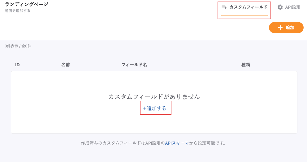 APIの作成が終了すると、右上にカスタムフィールドという項目があります。そのページにある追加するをクリックしましょう。