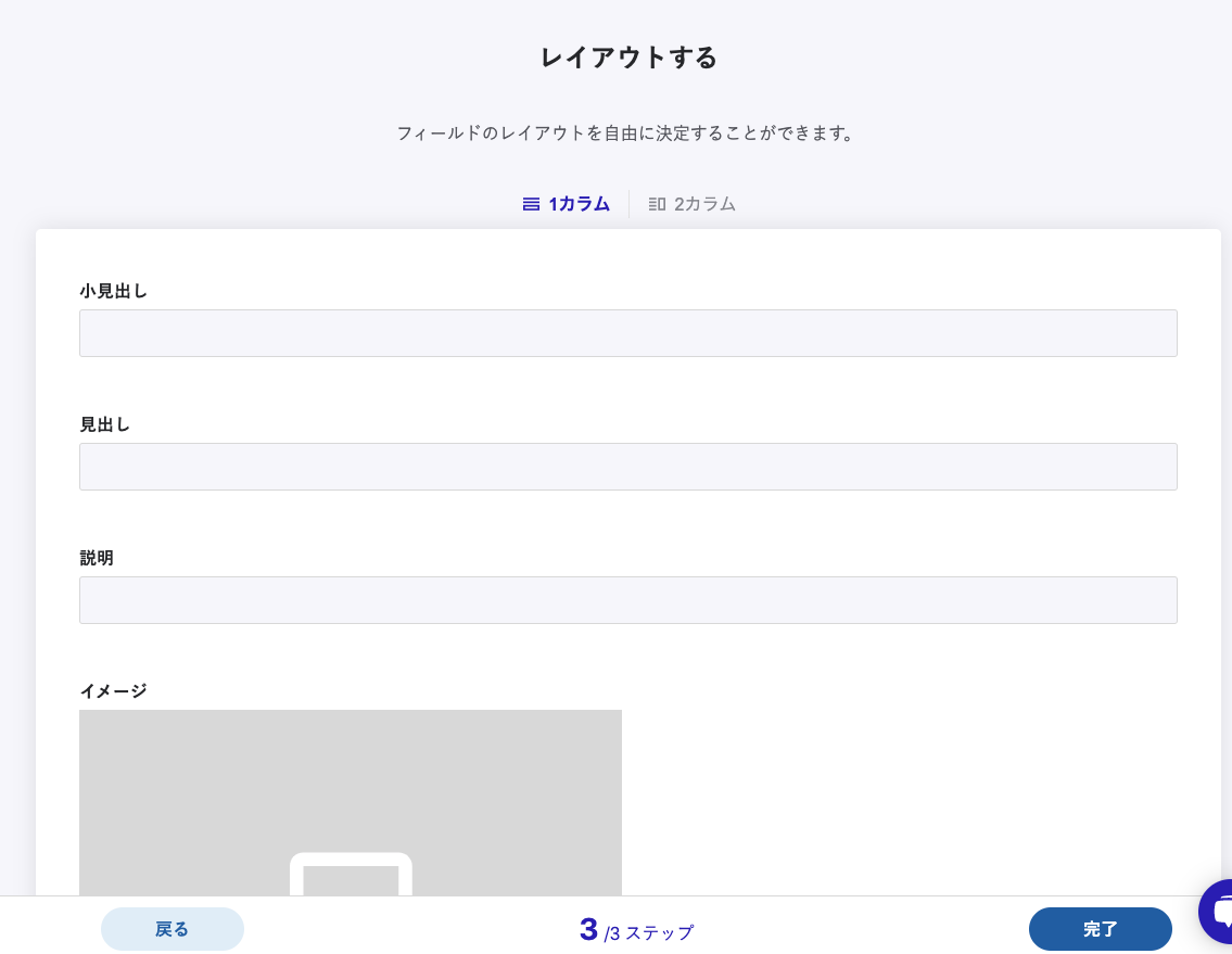 そして、レイアウトを作成することができます。今回は1カラムにします。完了をクリックすると、カスタムフィールドを作成することができます。