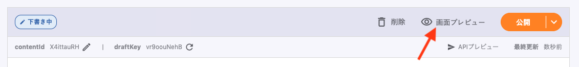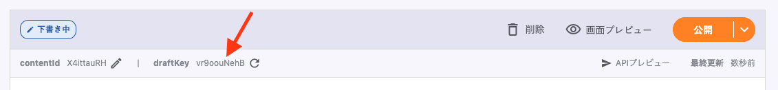 この draftKey の値はコンテンツ編集画面から取得することができます。