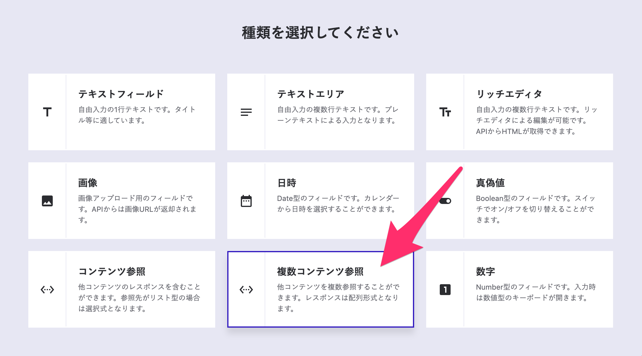 フィールドの種類を選ぶ際に「複数コンテンツ参照」を選んでください。