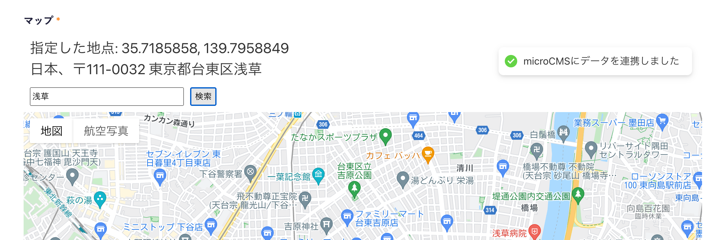 これでmicroCMSとGoogle Mapsが連携でき、「地図フィールド」を自作できました。