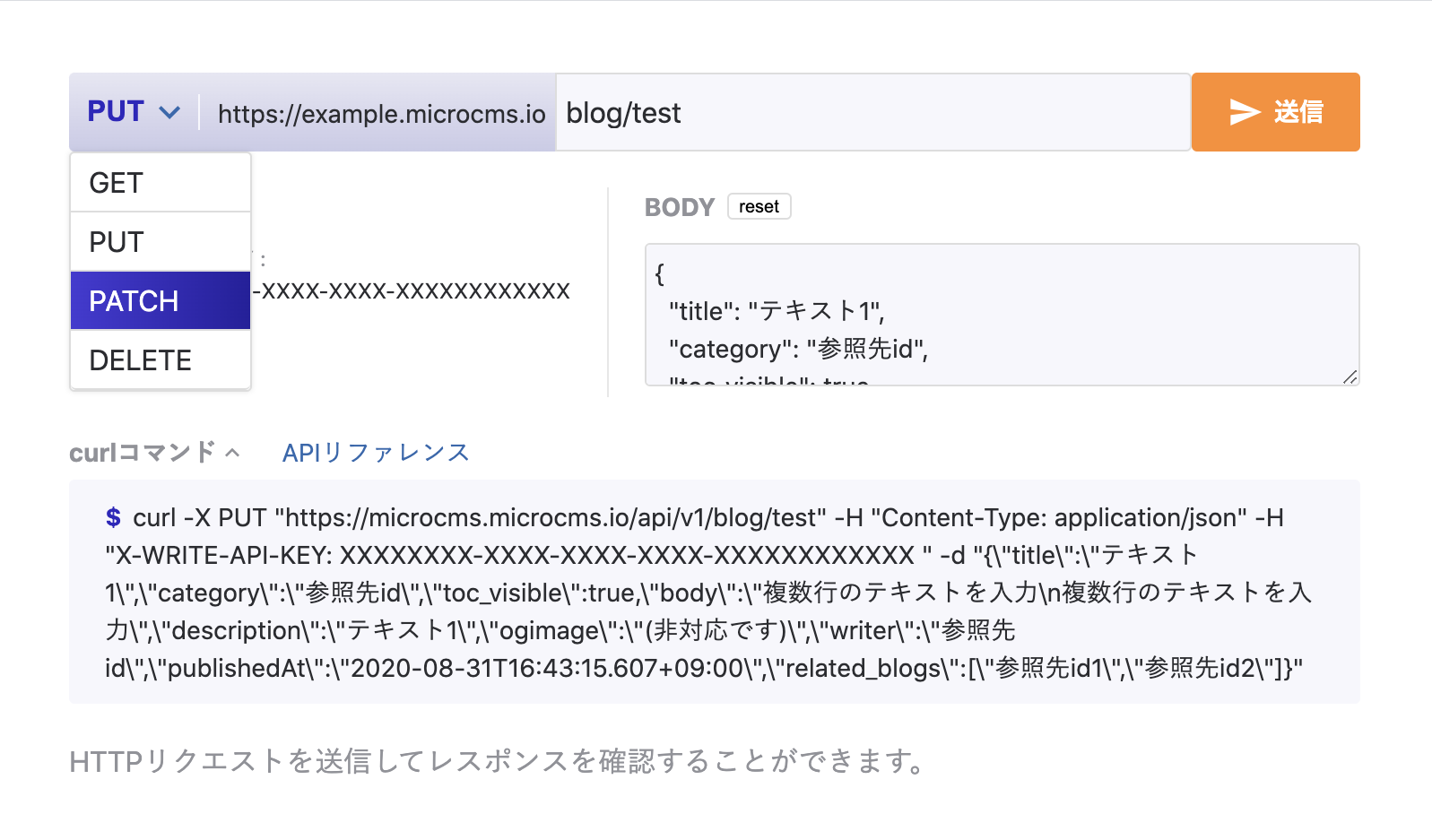 ※APIキーはX-MICROCMS-API-KEYに移行しました。PUT, PATCH, DELETE APIについてはドキュメントをご参照ください。詳しくはこちら