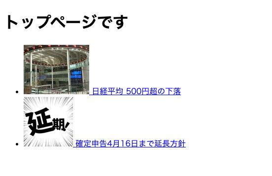 CSSなどは何も当てていないため非常に簡素なページですが、トップページにニュース記事一覧を表示することができました!
