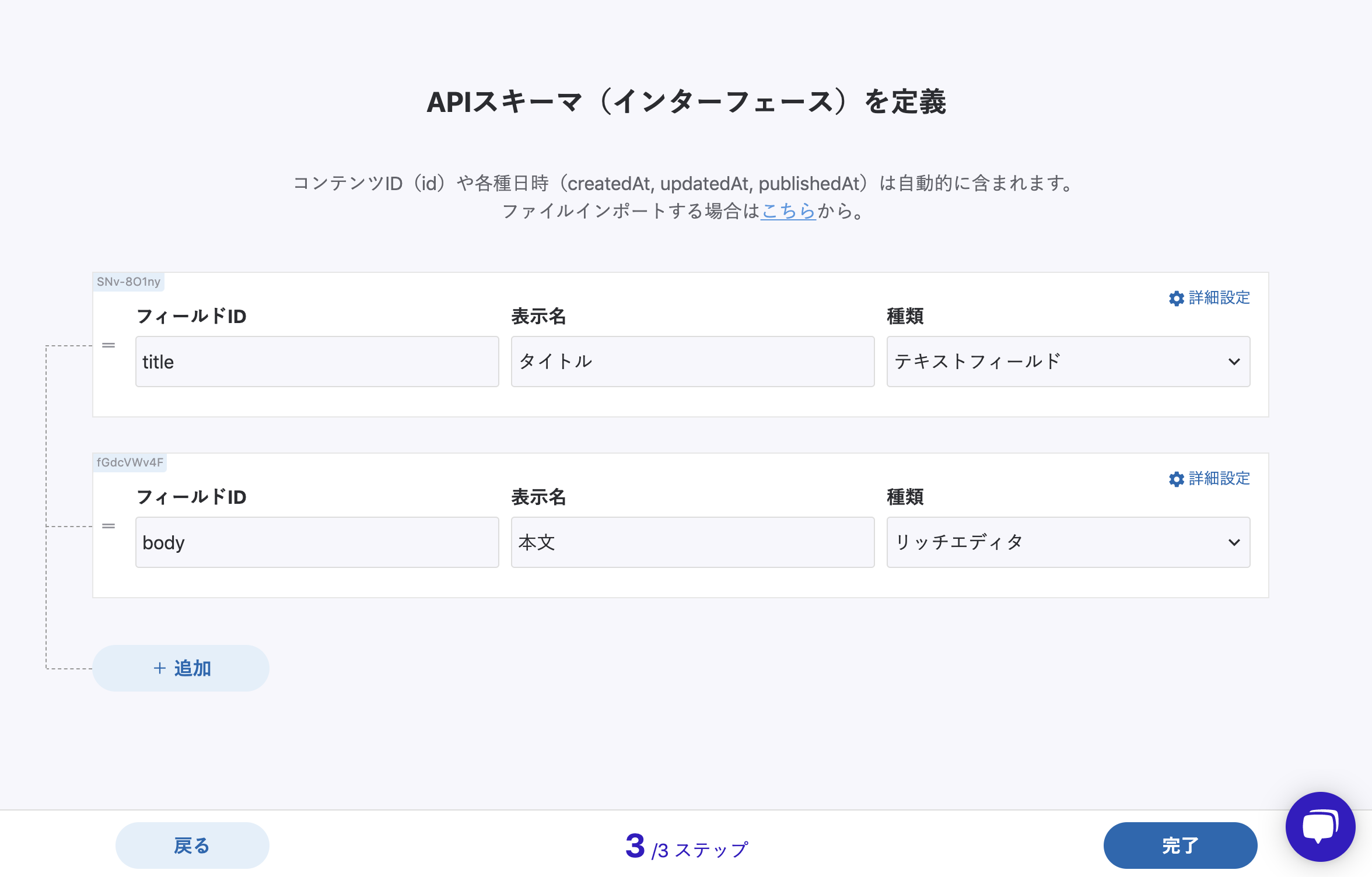 タイトル、本文のフィールドを用意します。