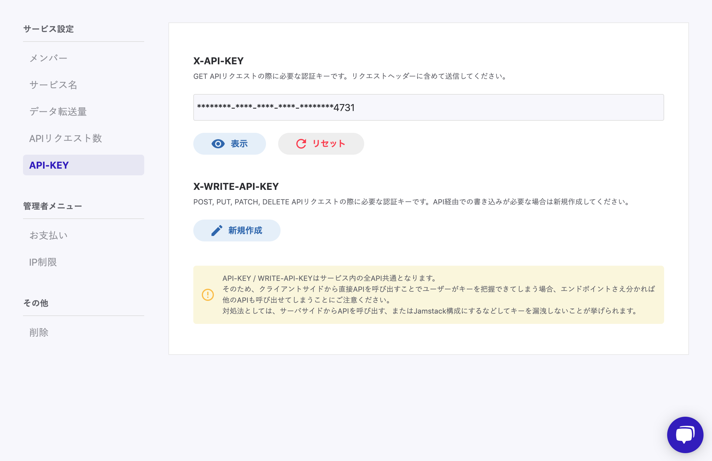次に、api-keyを設定するためにmicroCMSの管理画面に移動します。サービス設定 > API-KEYから確認ができます。
