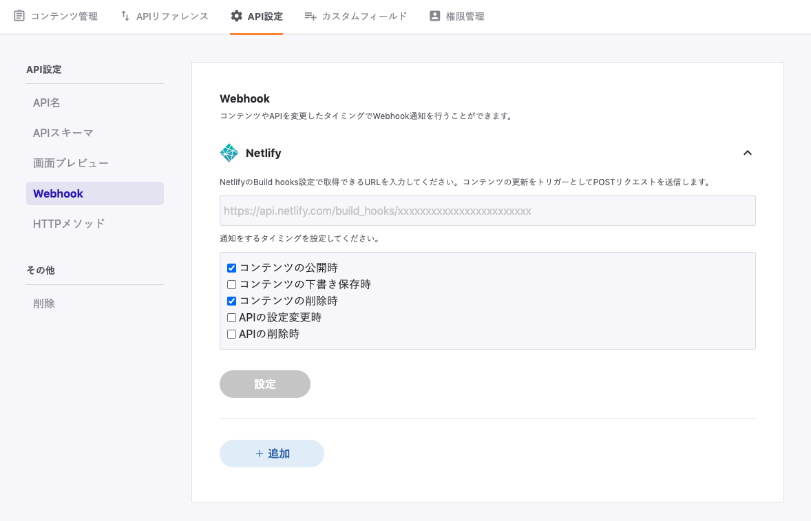 API設定 > Webhook からNetlifyを選択します。