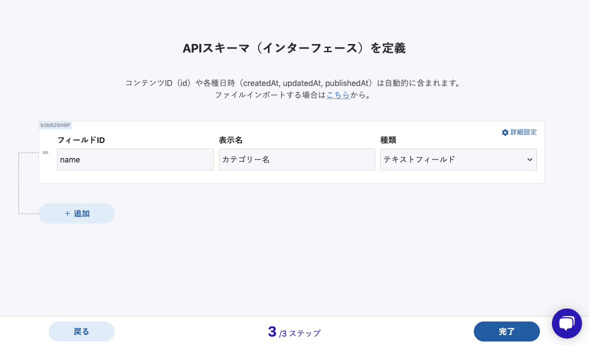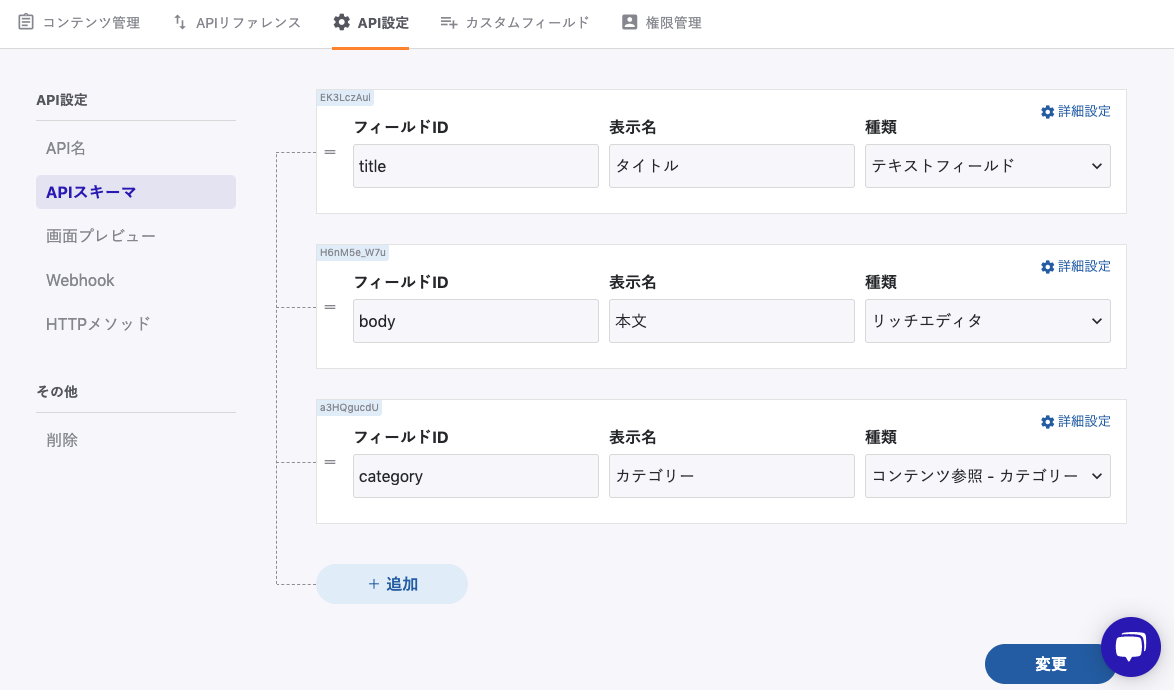 次に、ブログの API設定 > APIスキーマ に新しくカテゴリーフィールドを追加します。