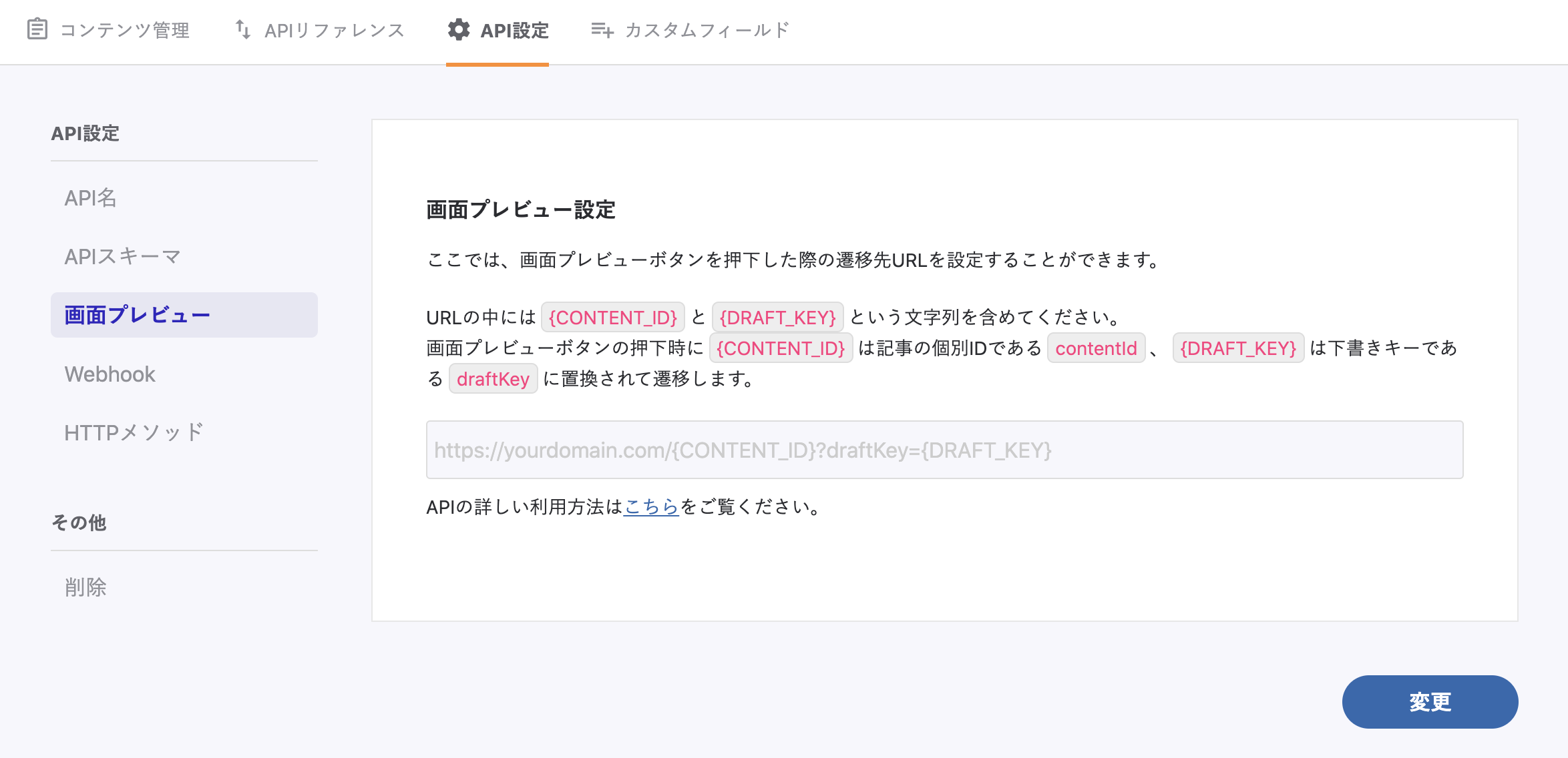 API設定 > 画面プレビューで、「画面プレビュー」ボタンをクリックした際の遷移先URLを指定することができます。