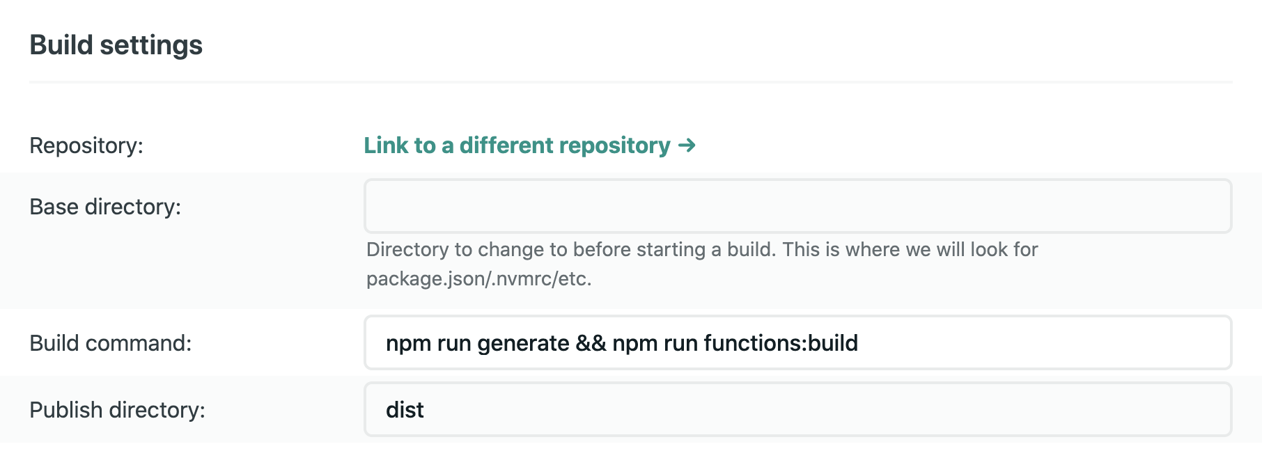 Jamstackによる静的ファイルのデプロイとNetlify Functionsのデプロイが必要なので、Netlifyには次のようにビルドコマンドを設定します。