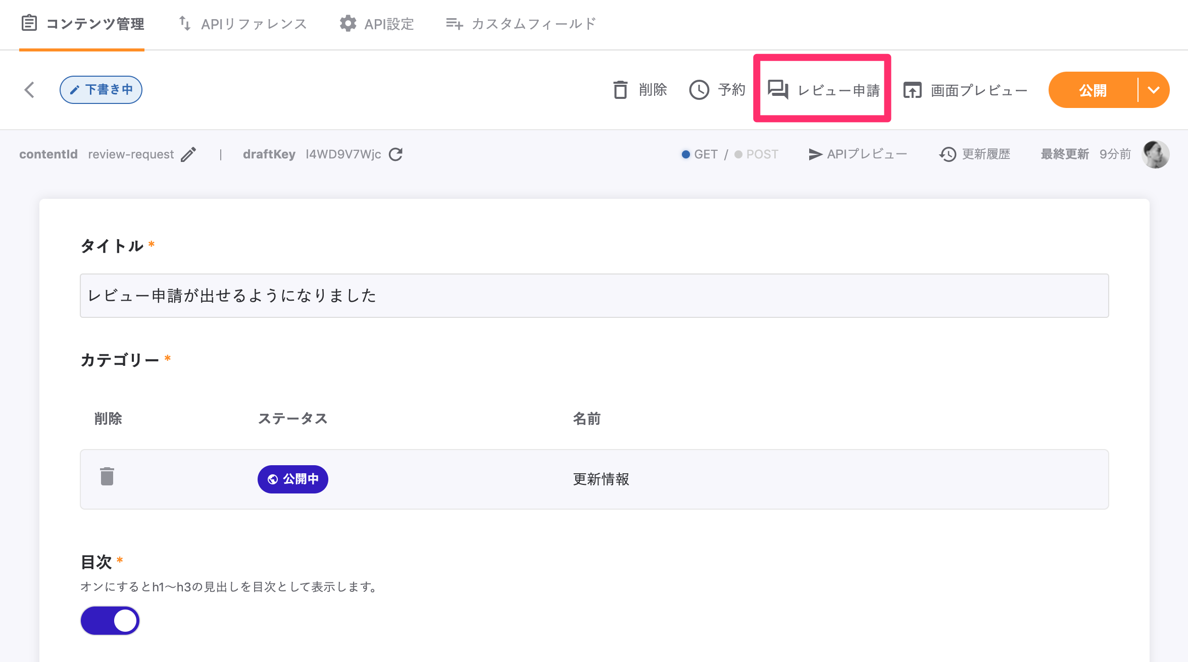 - 下書き状態のコンテンツのみレビュー申請が可能