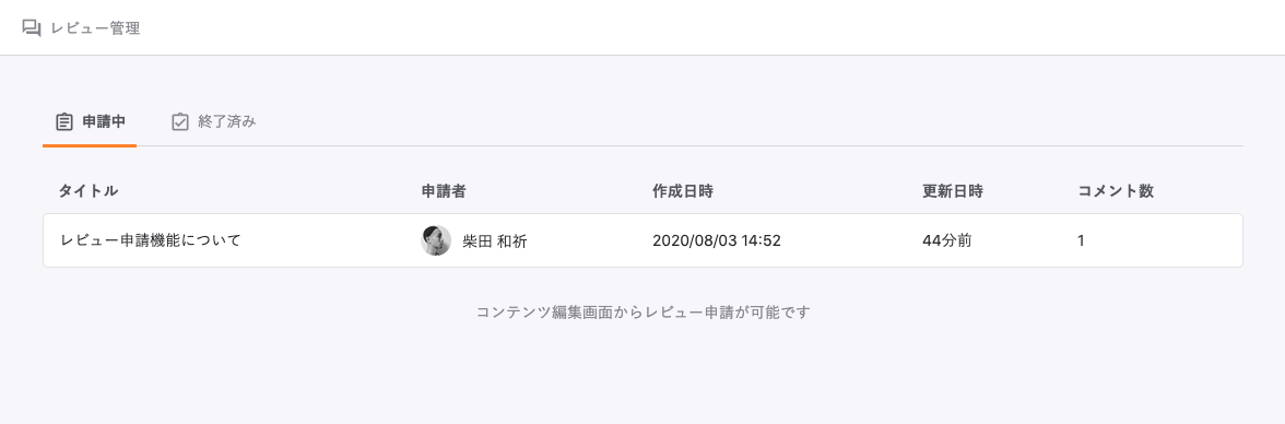 クリックすると現在申請中のレビューと終了済みのレビューの一覧画面に遷移します。