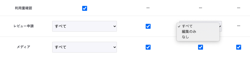 ロール設定画面にてレビュー申請まわりの権限が設定できるようになっております。