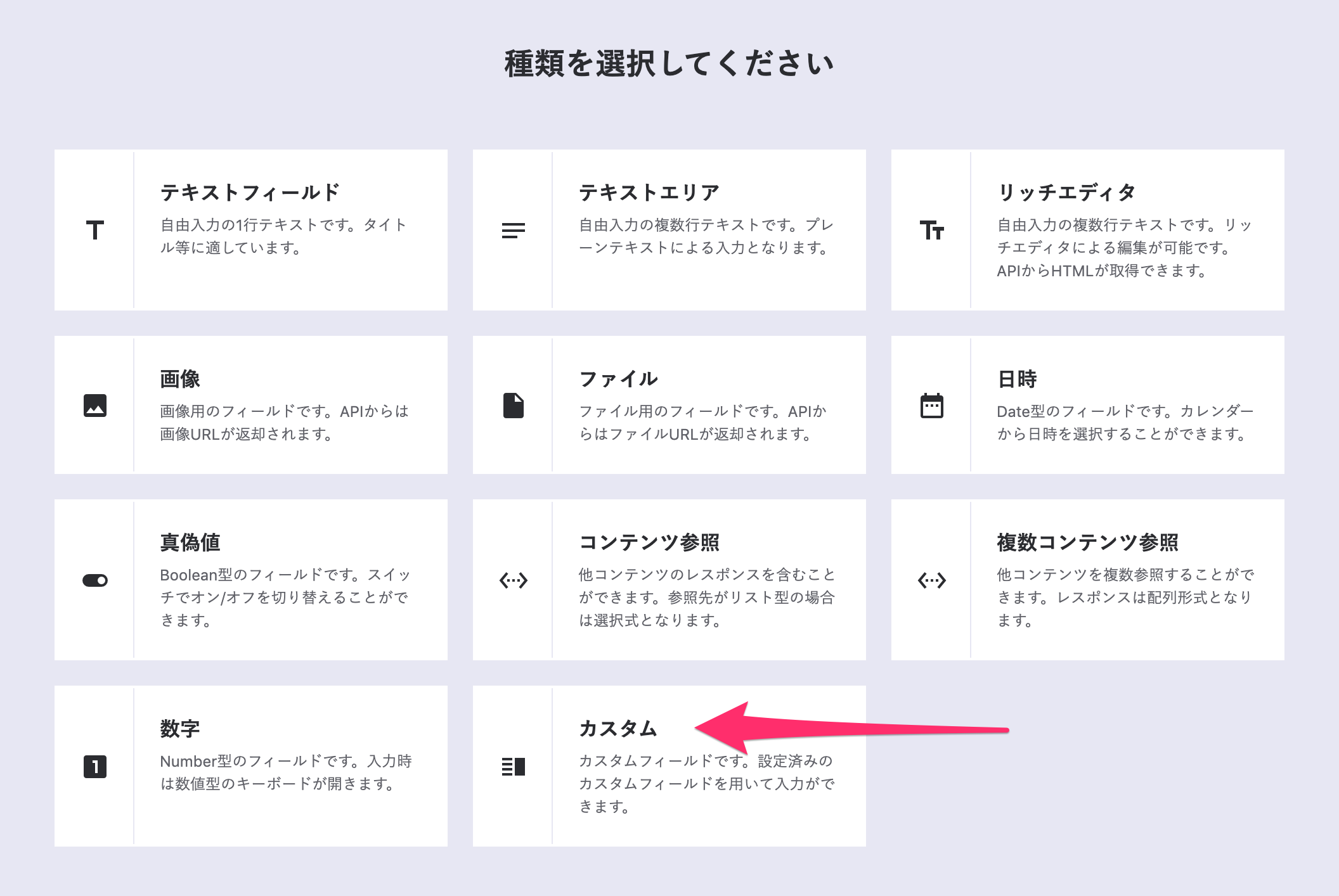 ここで、いずれかのフィールドの種類をクリックすると「カスタム」という種類が新たに追加されているはずです。(API作成時には出てきません)