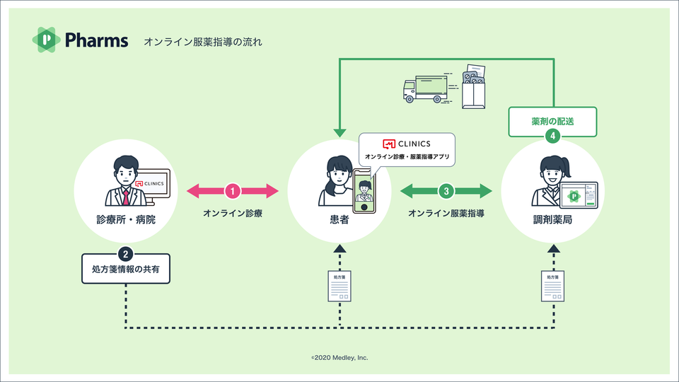 患者さんはオンライン診療・服薬指導アプリ「CLINICS(クリニクス)」をダウンロードすることで、病院に通って、お薬をもらうまでをオンラインで完結することが可能です。