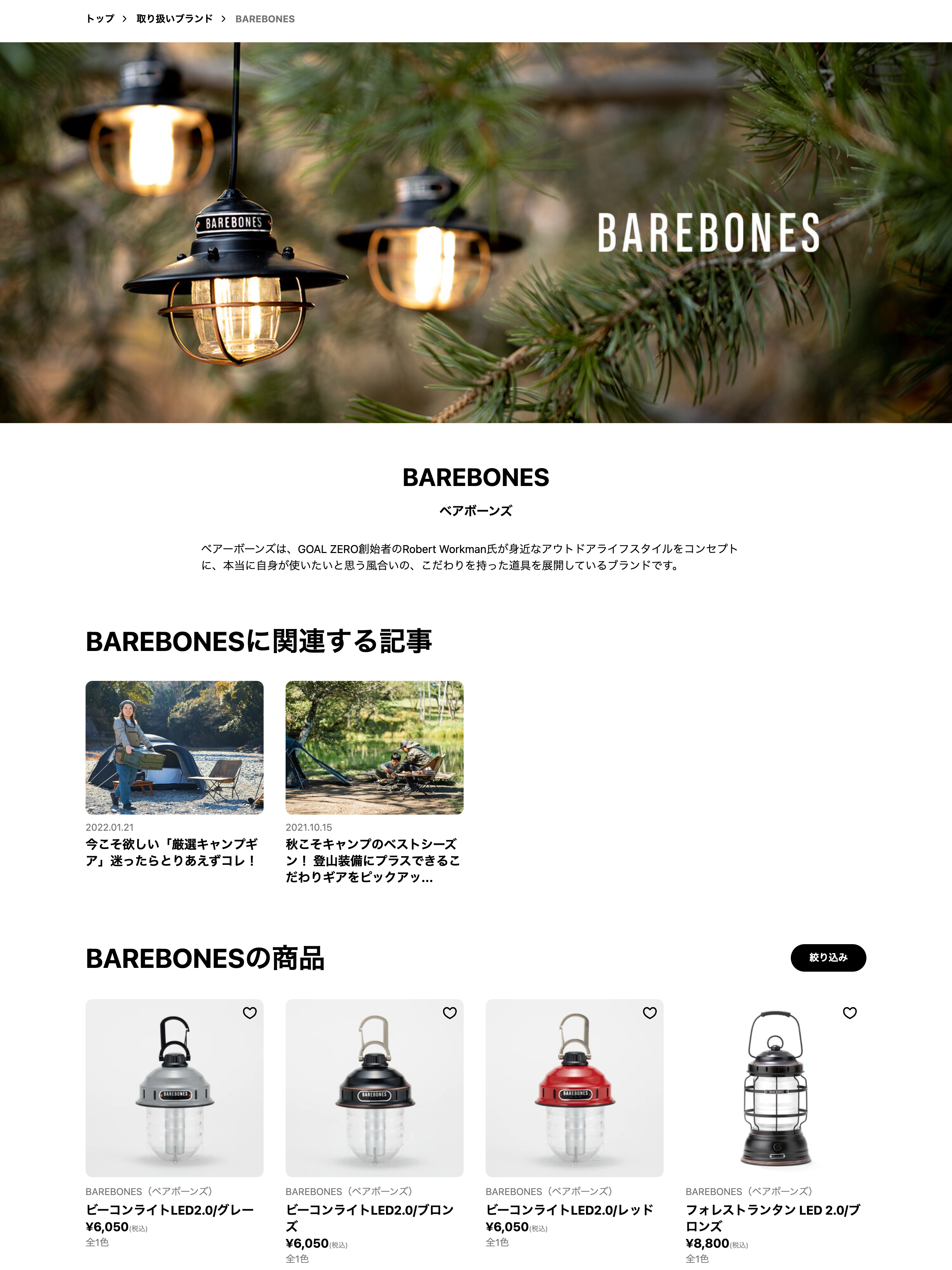 • 取り扱いブランド:詳細ページを見るとそのブランドの情報や関連記事・商品情報をShopifyから取得して表示するように設定