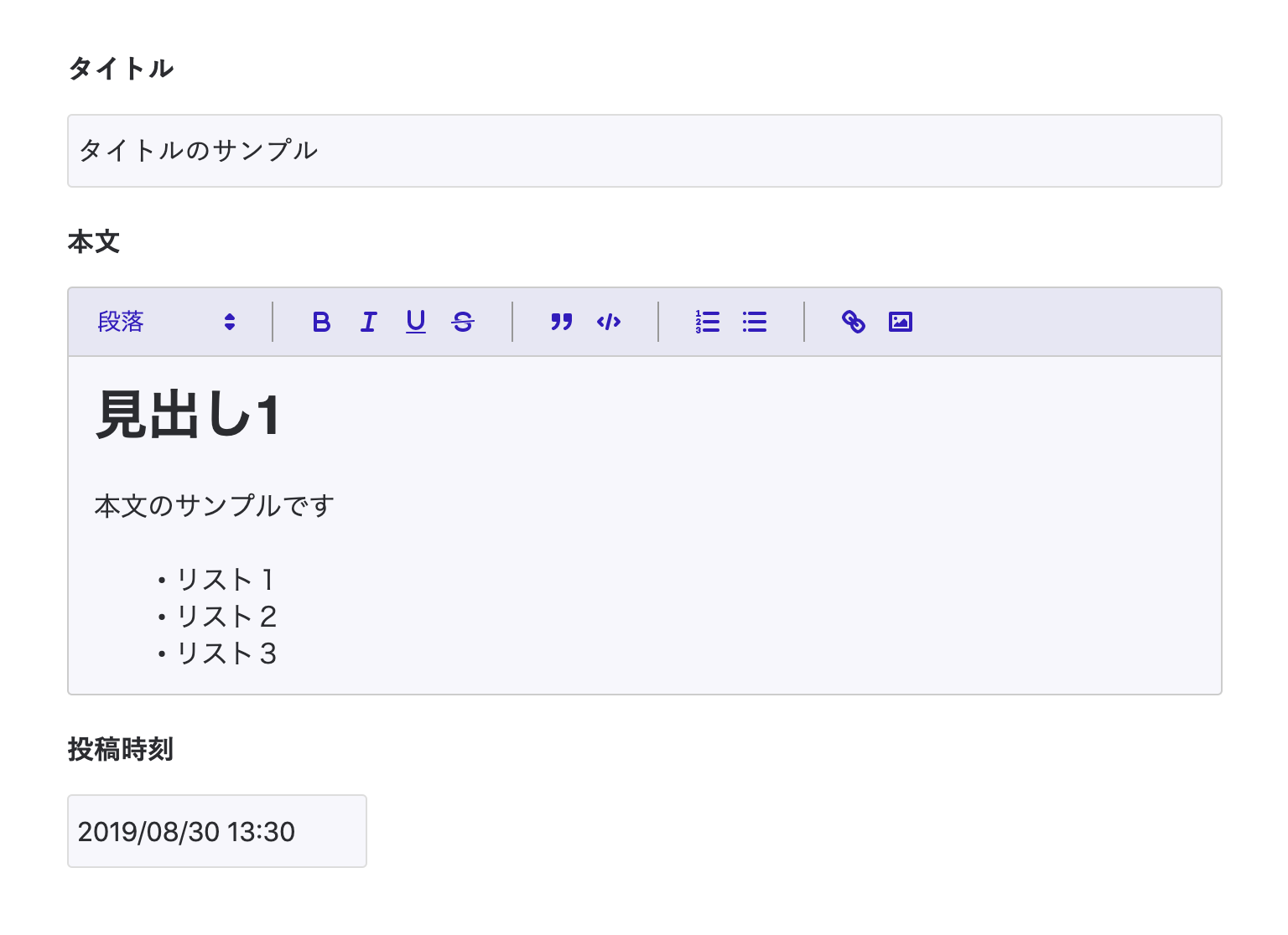 - 本文はテキストエリア(複数行のリッチエディタ)